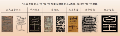 “秦五大夫翳刻石”之首的“皇帝”二字,不仅与传世峄山刻石中的“皇帝”写法相同,且与秦诏版、秦更名木方中的“皇帝”写法相同,均遵从秦统一后“书同文”规定用“白”不用“自”,且在“皇”字下面“王”的书写中,靠上两横明显接近,最下一横则相距较远。当然,“帝”字的写法也高度相似,体现出它们具有共同的时代特点。